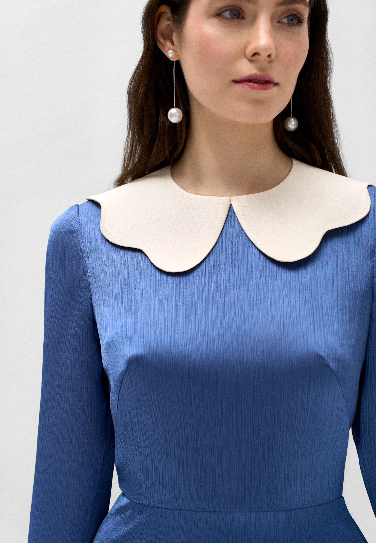Съёмный воротник из натурального шёлка жемчужного оттенка с волнистым краем, напоминающим раковину, на которой стоит Венера, создаёт образ нежной и утончённой девушки.