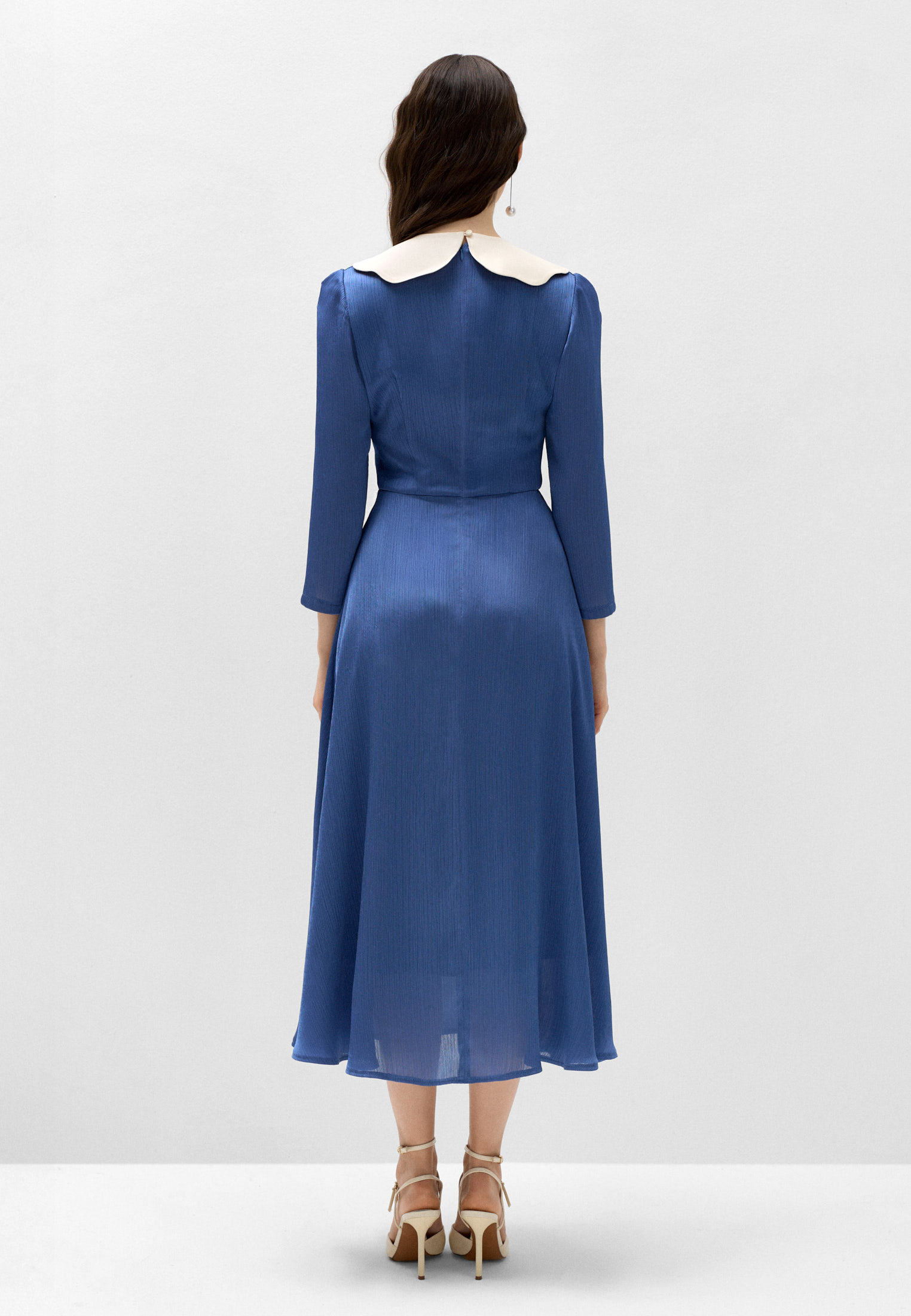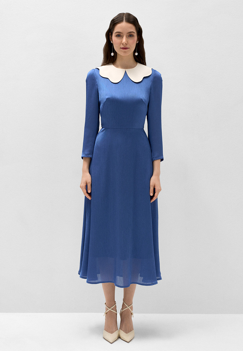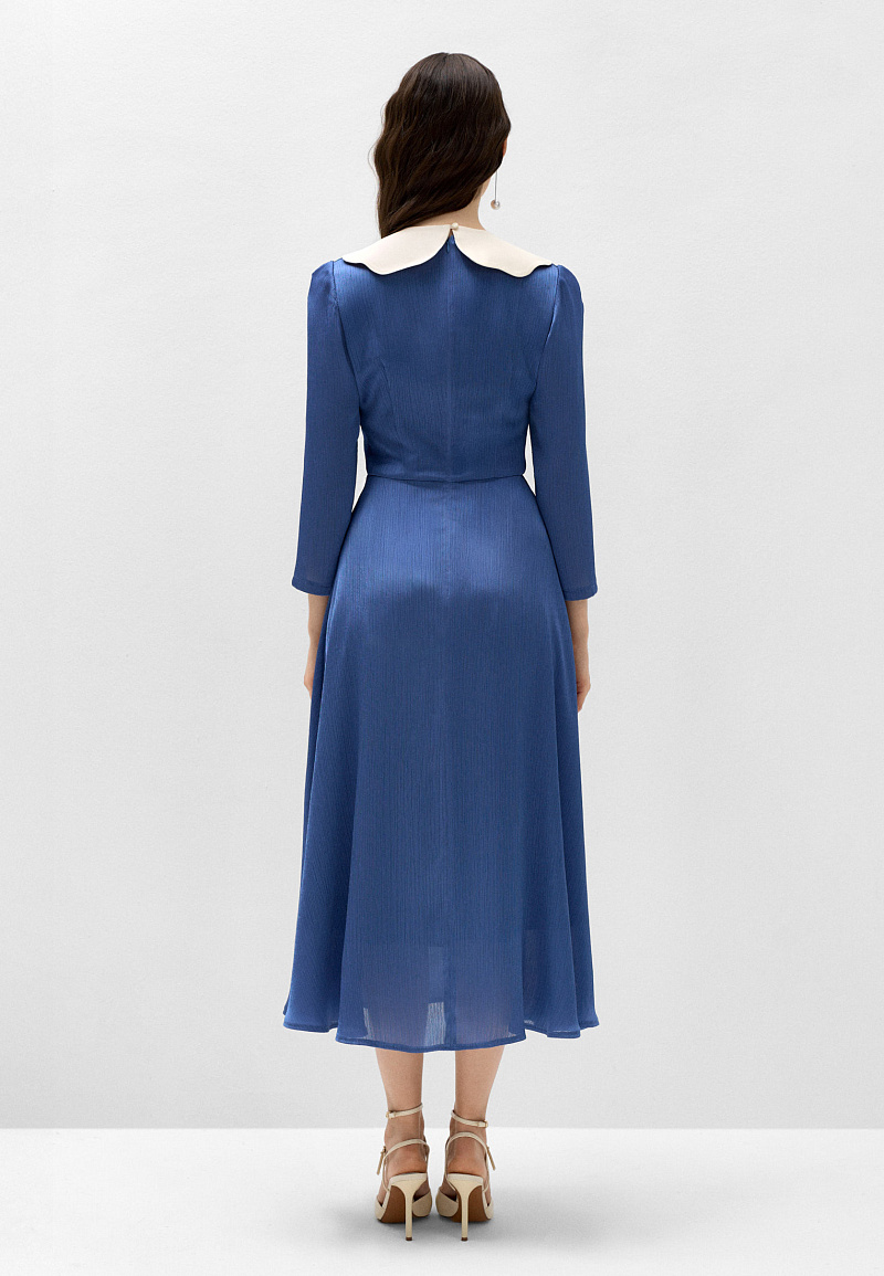 Классическое платье с девичьим настроением, воплощающее свежесть и чистоту морских волн. Приталенный силуэт подчёркивает линию талии и груди, а летящая юбка длины миди придаёт образу лёгкость и женственность.