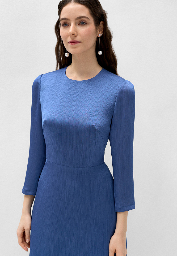 Модель выполнена из атласа с крэш-эффектом в насыщенном синем оттенке и дополнена вискозной подкладкой. Лаконичный крой гармонично сочетается с укороченными рукавами, подчёркивающими хрупкость запястий.