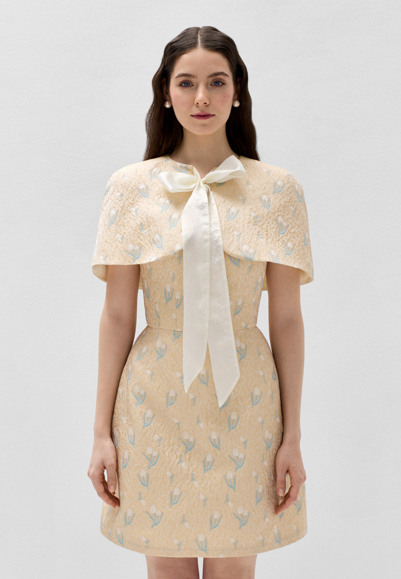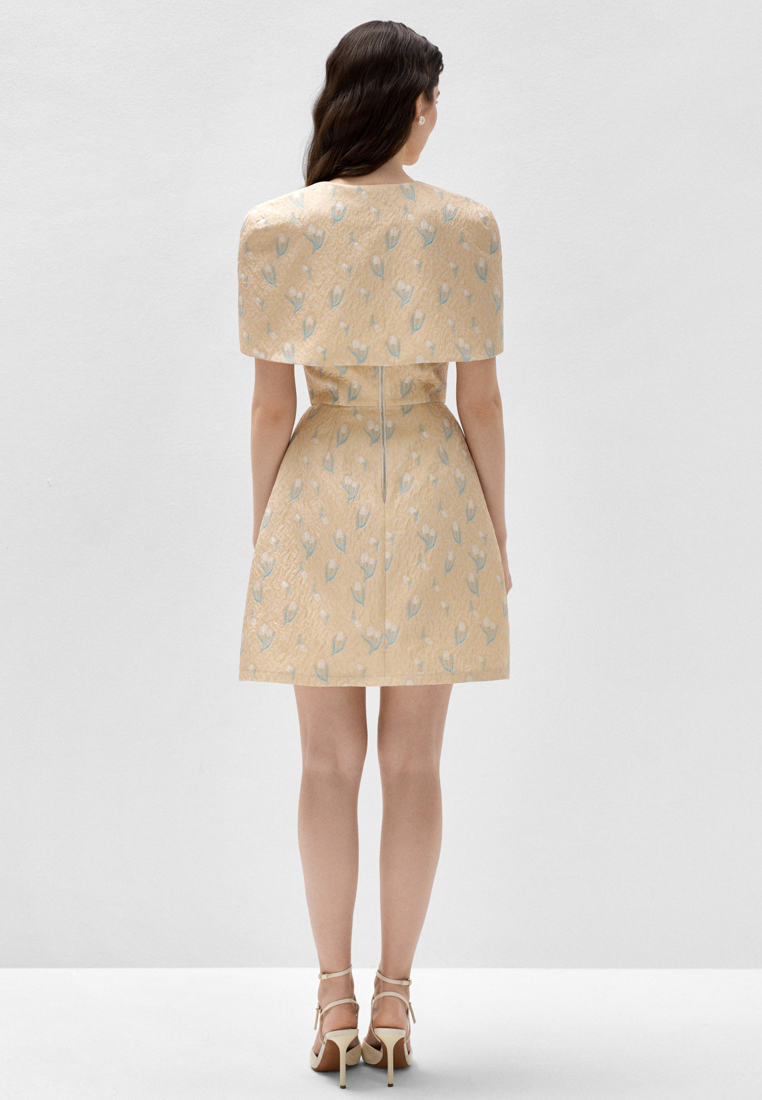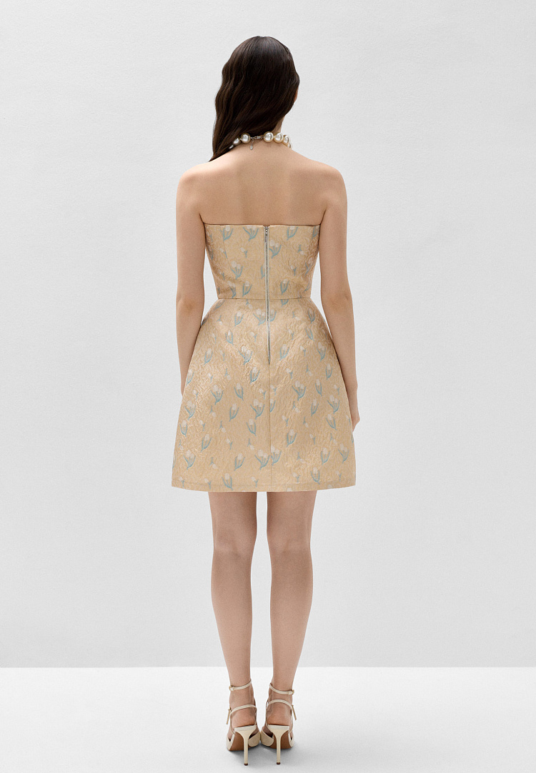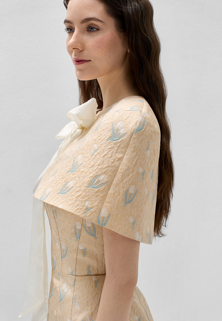Золотистый жаккард с тюльпанами создаёт весеннее настроение: ткань воздушная и лёгкая. Косточки в корсете и регилин, вставленный в боковые швы юбки и по подолу, придают силуэту чёткость и актуальную в этом сезоне театральность.