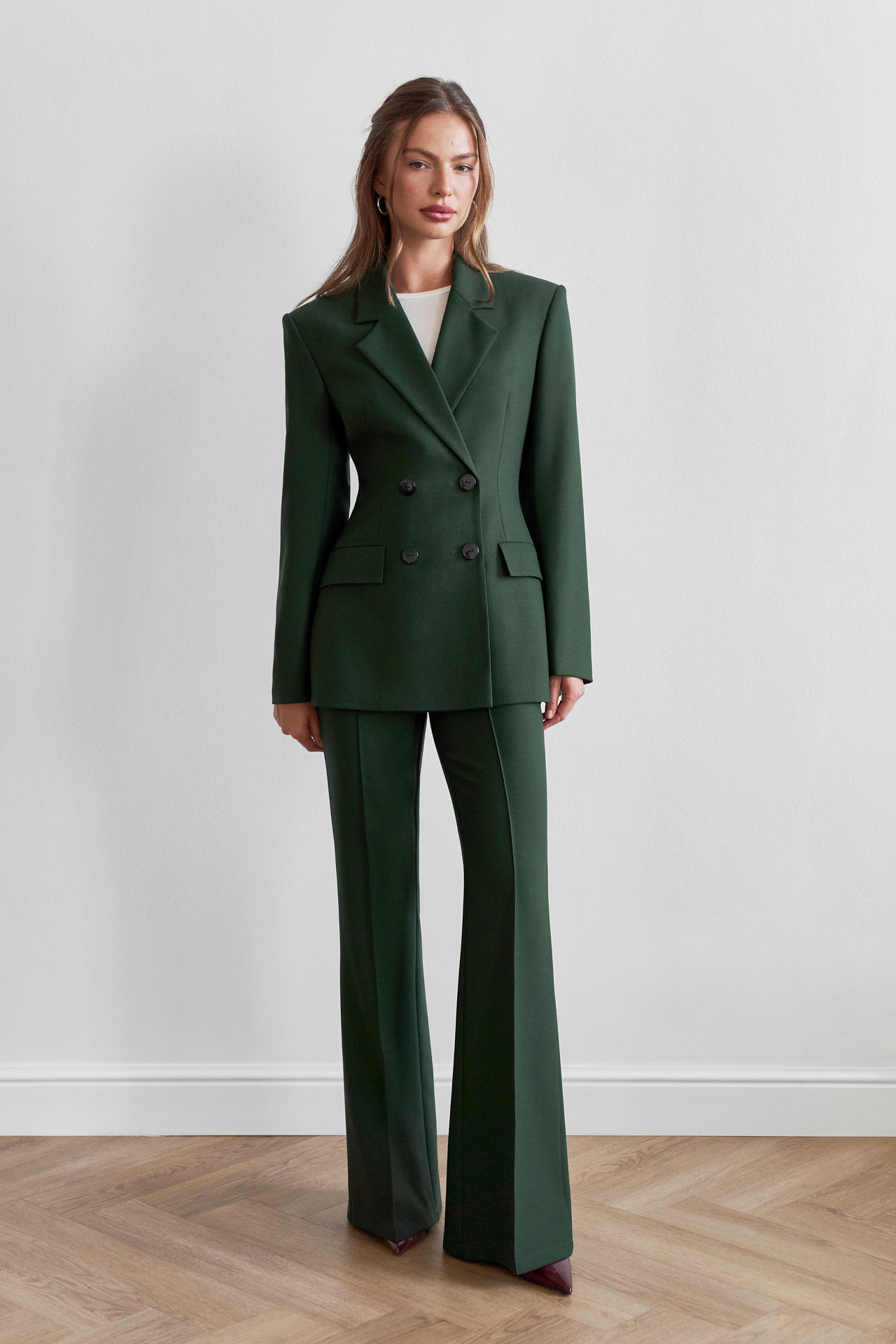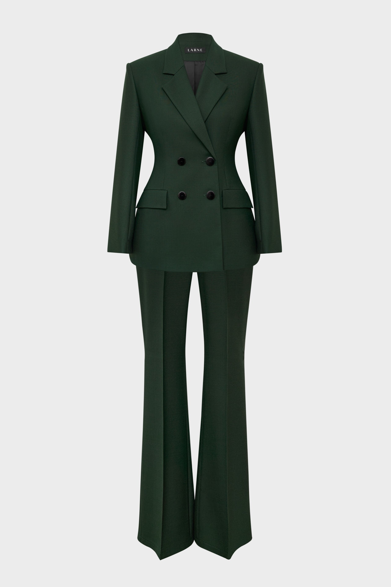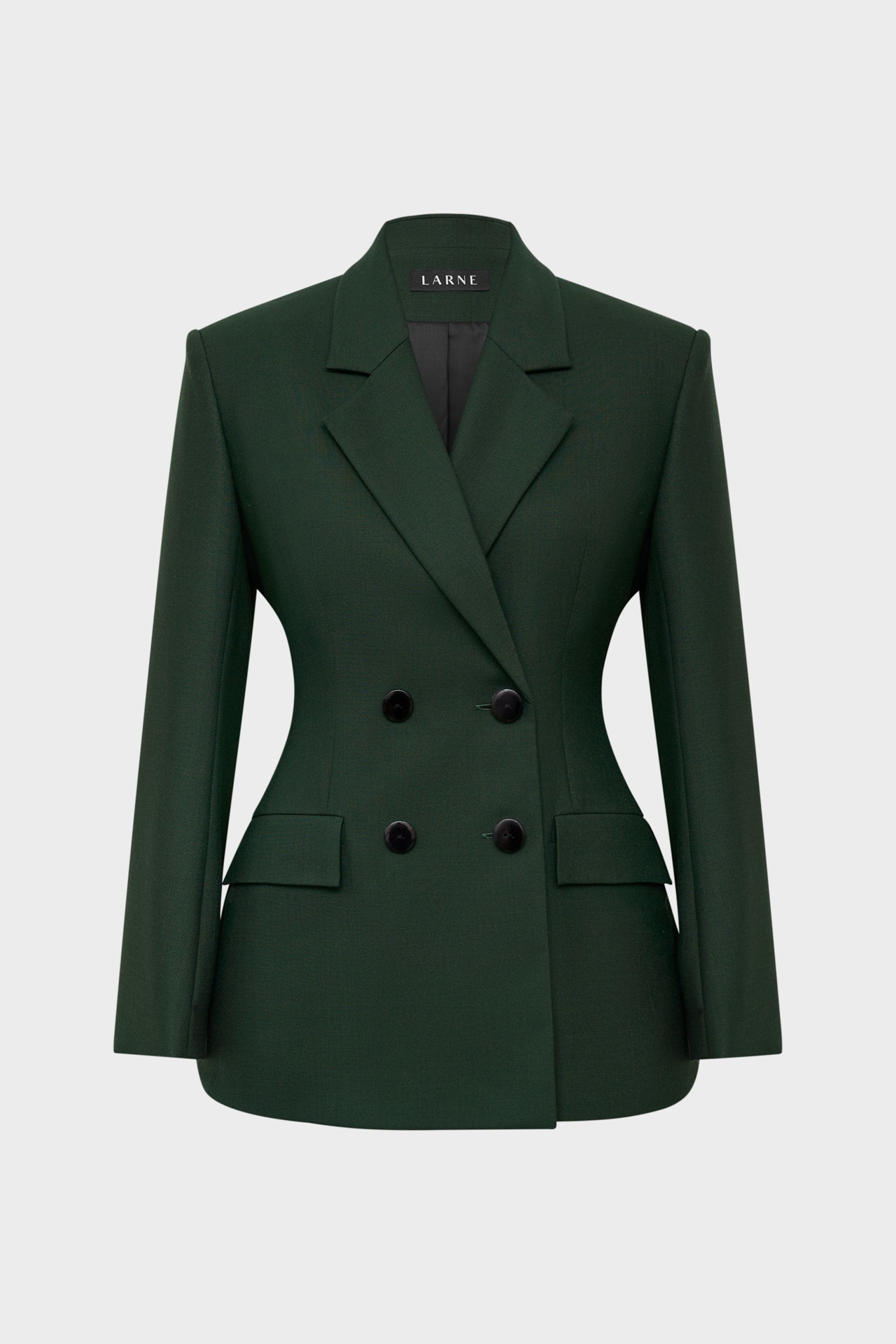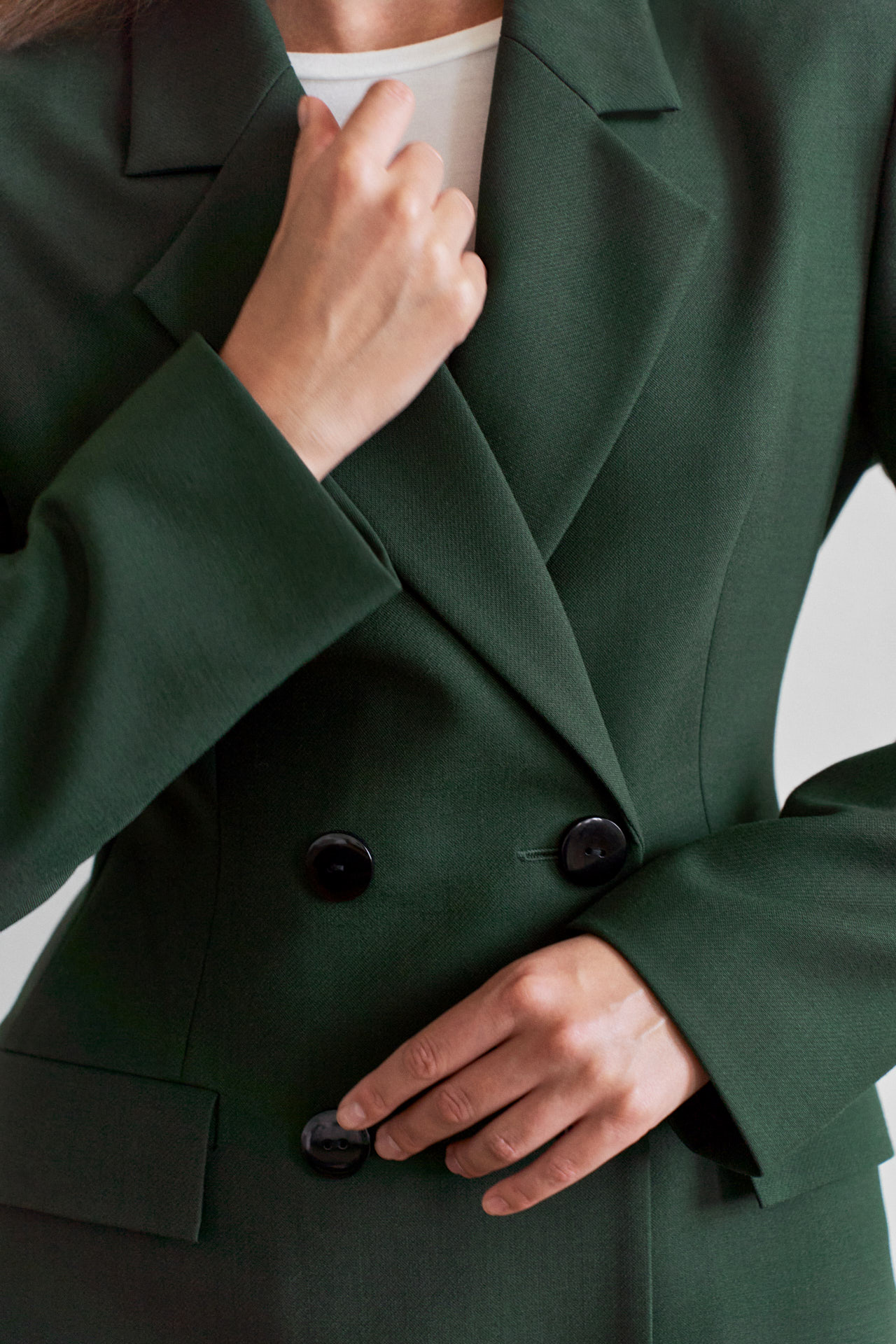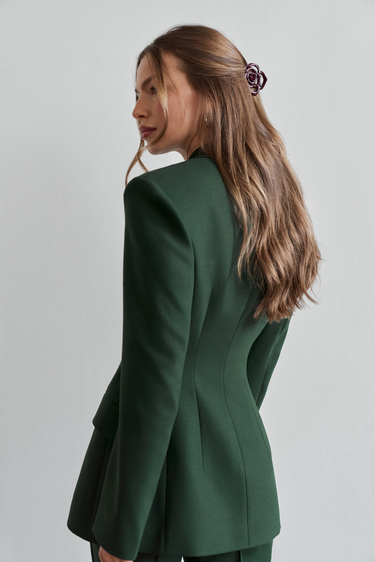 • Приталенный двубортный жакет в насыщенном тёмно-зелёном цвете. Выразительная линия плеч, лацканы и карманы с клапанами создают чёткий силуэт. Тонкая костюмная ткань с добавлением шерсти мягкая, шелковистая на ощупь, не колется и не сковывает движения. Подходит как для деловых встреч, так и для особых случаев.
