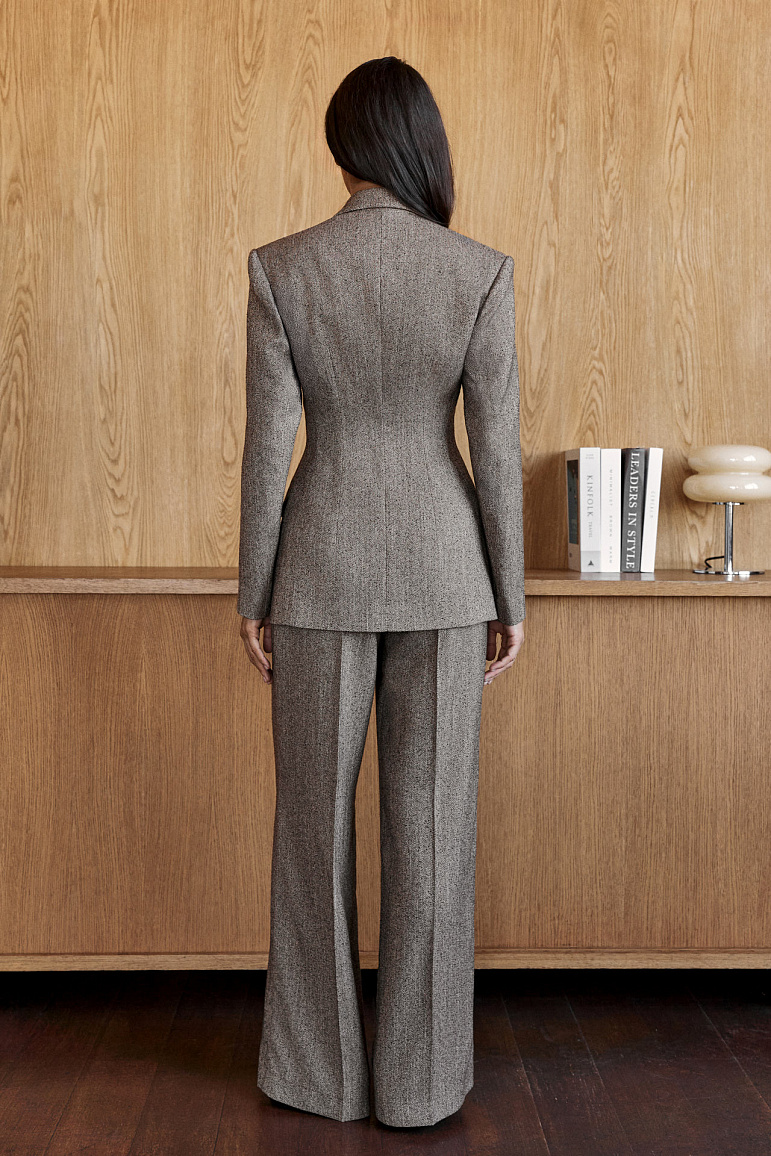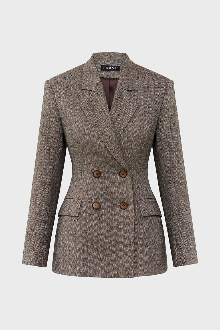 Классический двубортный жакет приталенного кроя с узором «ёлочка». Аккуратно подчёркивает силуэт, подходит для офиса и деловых встреч. Лацканы, пуговицы в тон и карманы с клапанами придают образу строгость и элегантность.