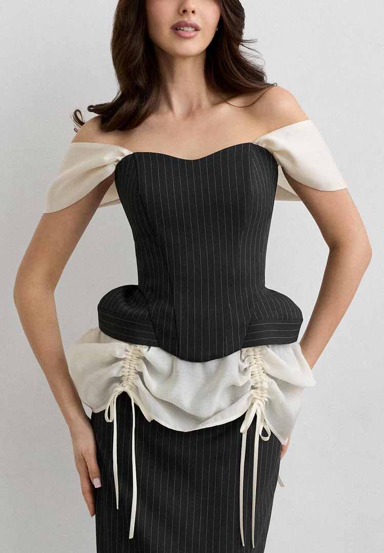 Корсетный топ с открытыми плечами, на корсетных рёбрах жёсткости, с объёмными боковыми вставками в историческом стиле. Выполнен из контрастной ткани в тонкую полоску, с воздушными декоративными бретелями из органзы. Оснащён основной застёжкой — металлической молнией на спинке, а также дополнительной потайной застёжкой на крючки, обеспечивающей идеальную фиксацию. Жёсткая конструкция с косточками моделирует силуэт «песочные часы», а графичные линии, расходящиеся от талии, повторяют структуру морской ракушки — центрального элемента картины Боттичелли и источника вдохновения для данной коллекции.