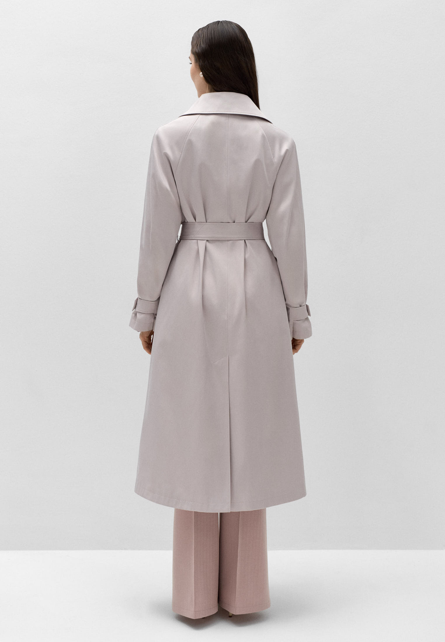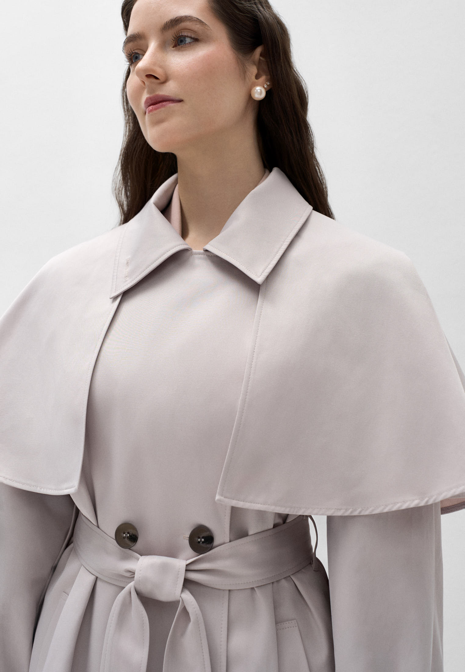 Для классических образов пелерина снимается, воротник распахивается — и получается классический, идеально сидящий плащ без лишних деталей.