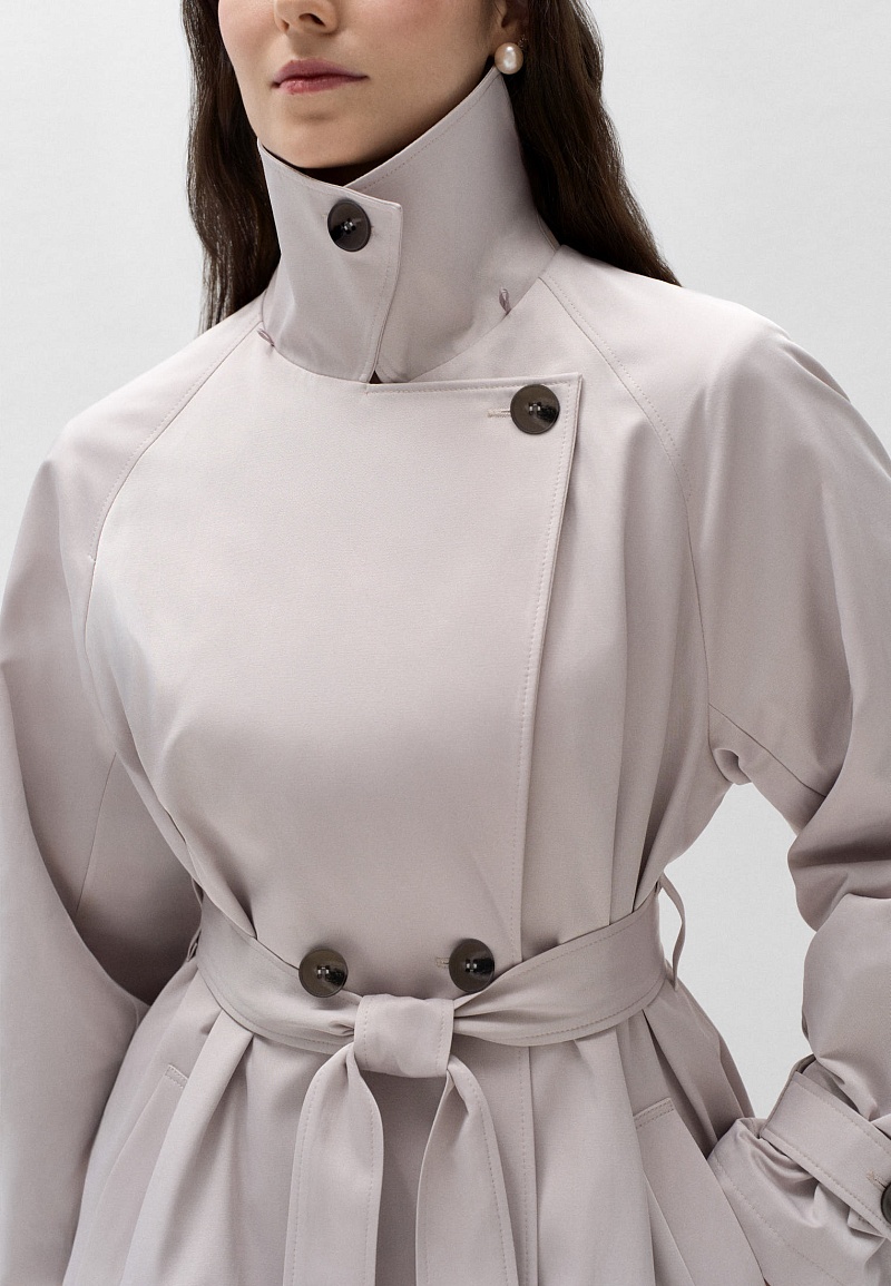 Плащ выполнен из мягкой водоотталкивающей ткани с вискозой, на вискозной подкладке. Основная особенность — возможность носить и стилизовать плащ по-разному.