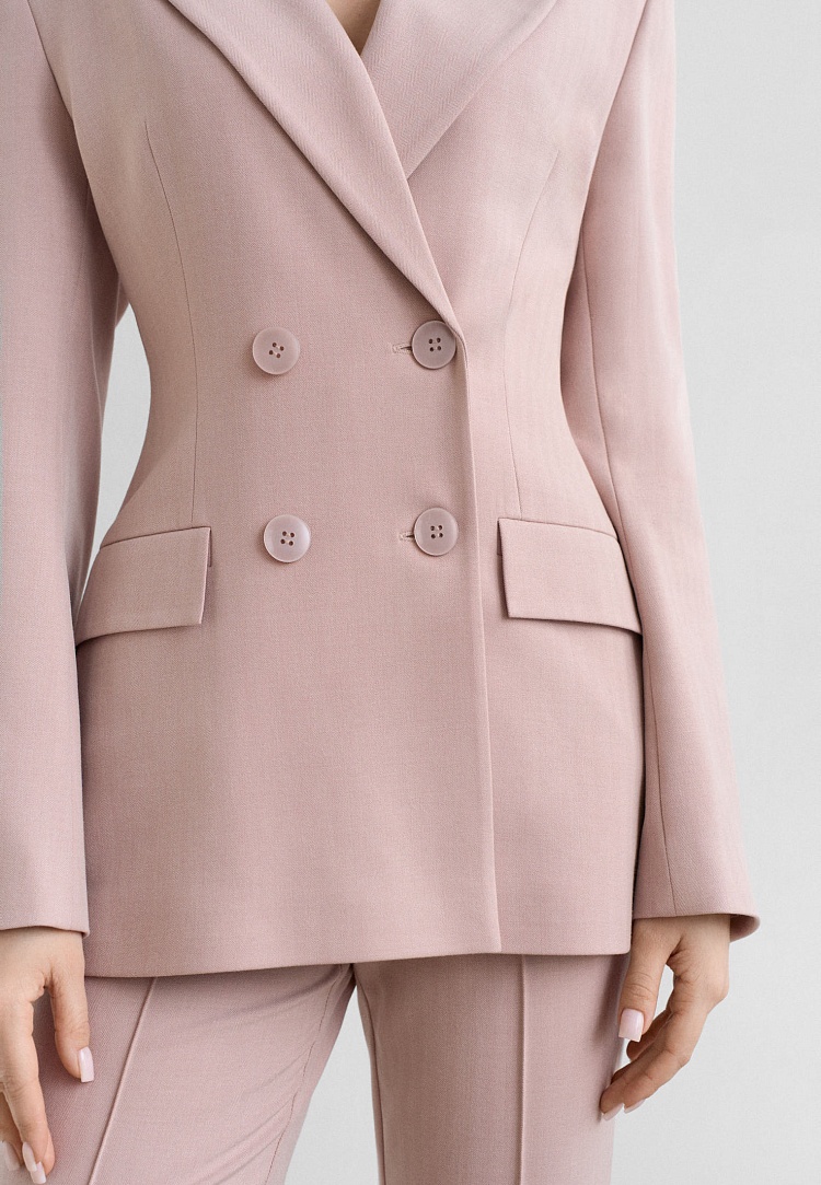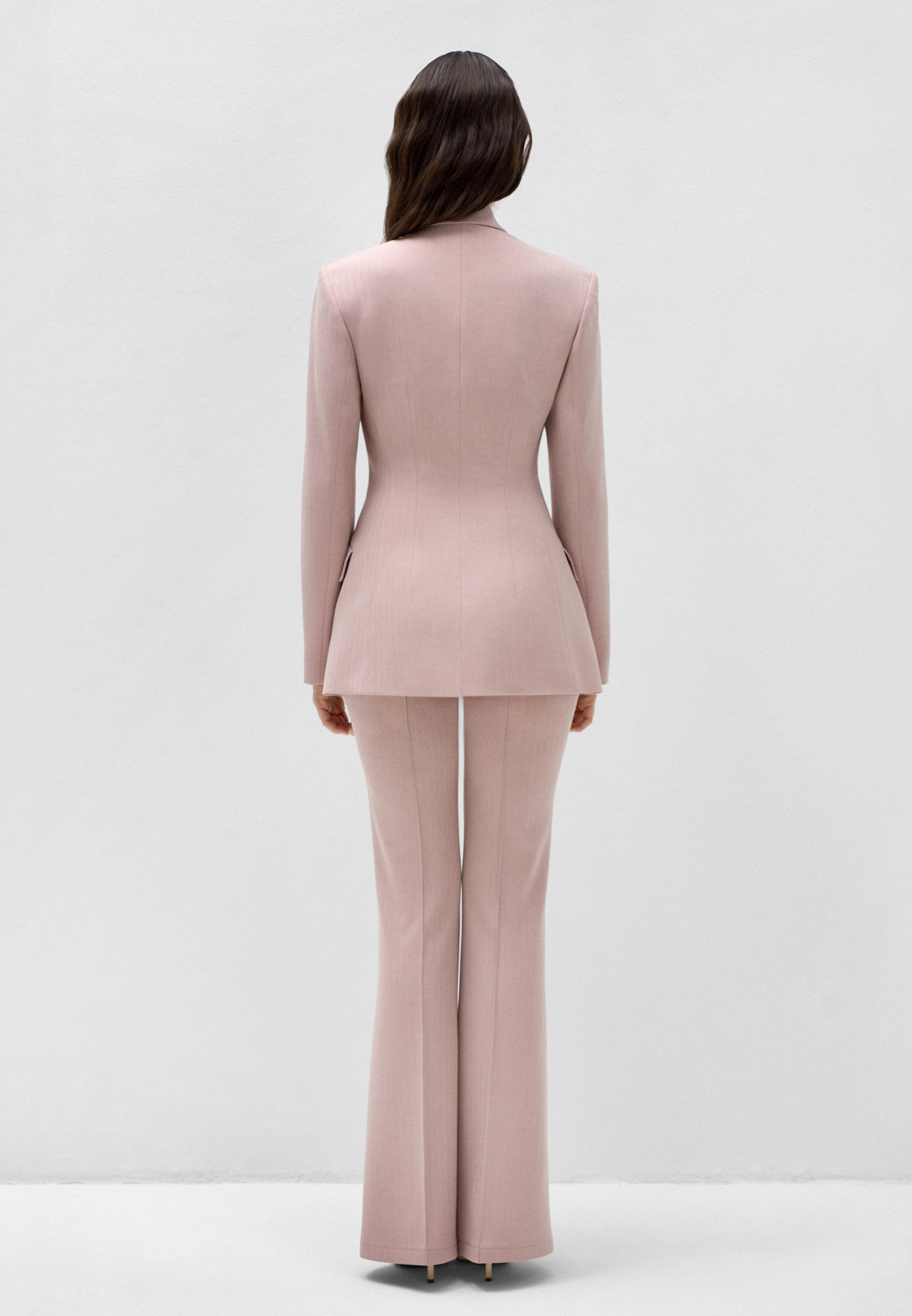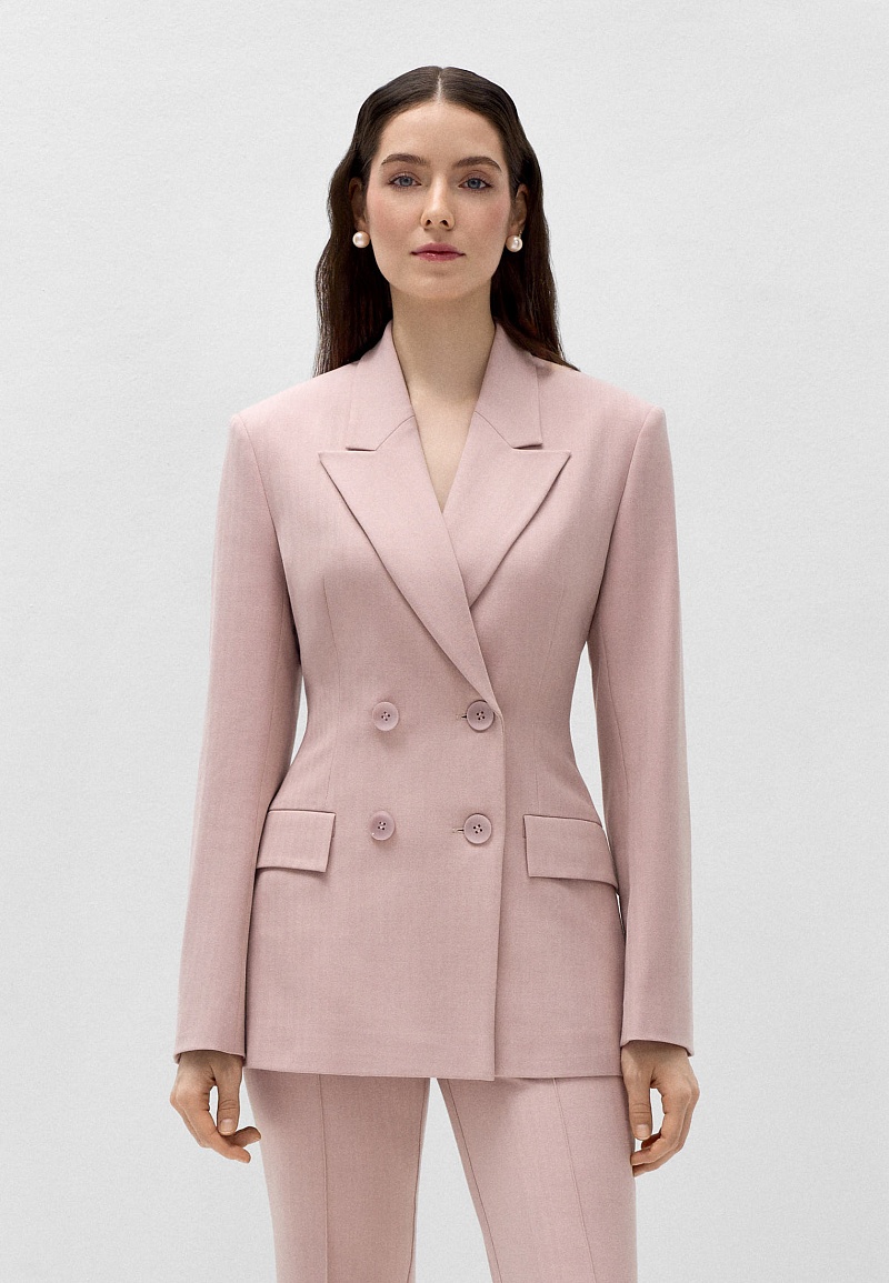 Сочетание строгости классического жакета с лацканами и мягкости цвета создаёт выверенный баланс силы и нежности.