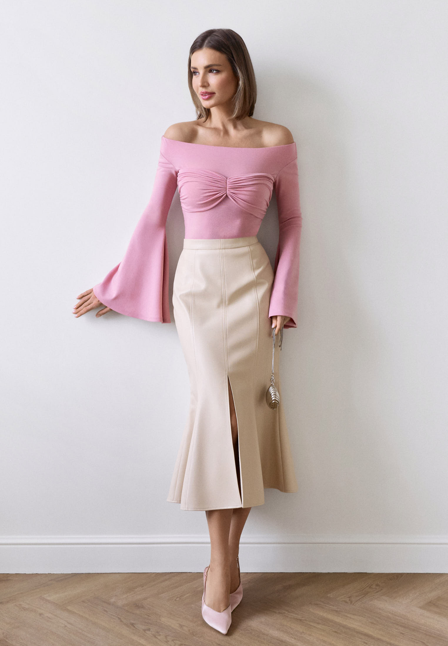 Юбка силуэта «русалка» из экокожи на хлопковой основе в бежевом оттенке. Облегающий крой до колена подчёркивает линию бёдер, а плавное расширение книзу формирует выразительный силуэт, напоминающий хвост русалки и отсылающий к источнику вдохновения.